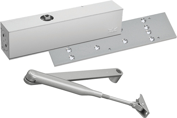 Komplett paket med dörrstängare TS83 i silverutförande, delbar och justerbar standardarm CL-N samt montageplatta.