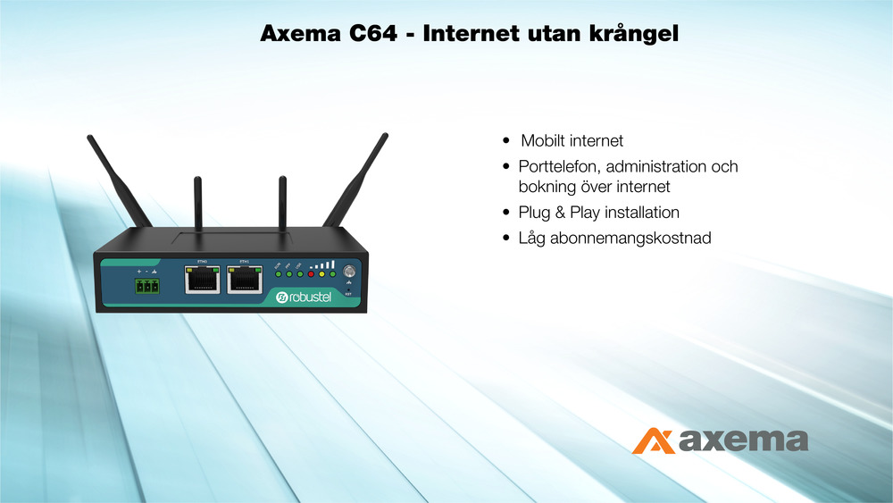 Router 4G, mobilt internet för VAKA porttelefoni, bokning och fjärradministration. Inkl. transformator 12 VDC, 2 st. antenner för montering på routern samt tillbehör för väggmontering (inomhus). Routern C64 är en förkonfigurerad Plug&Play-lösning skräddarsydd för Axema VAKA som innebär snabb och enkel driftsättning.